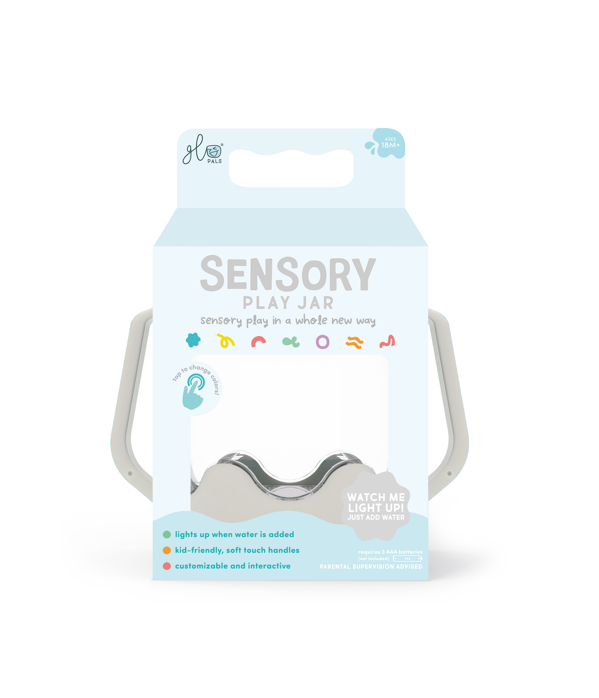Pack some fun and adventure into your next outing with a Sensory Play Jar! Tap to change the liquid-activated light colors. Features a spill-proof lid. Requires 3 AAA batteries (not included)