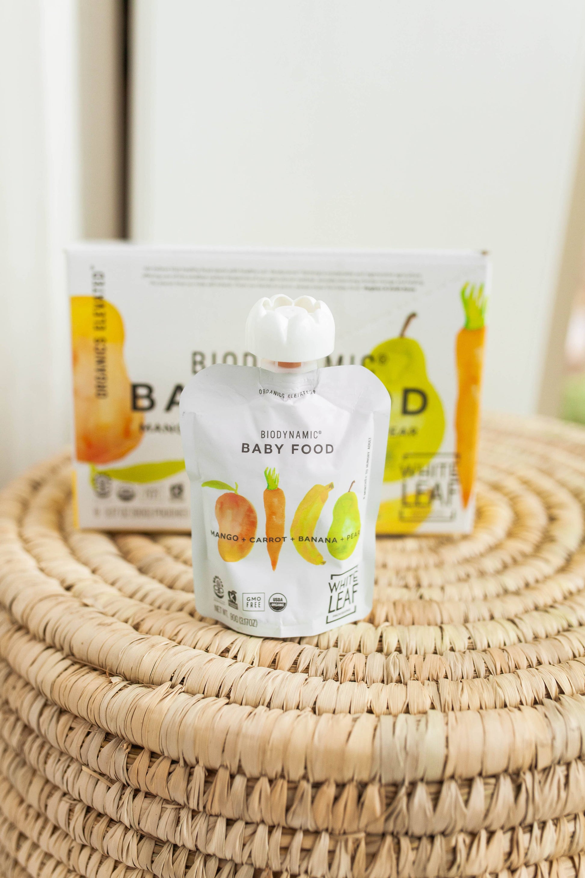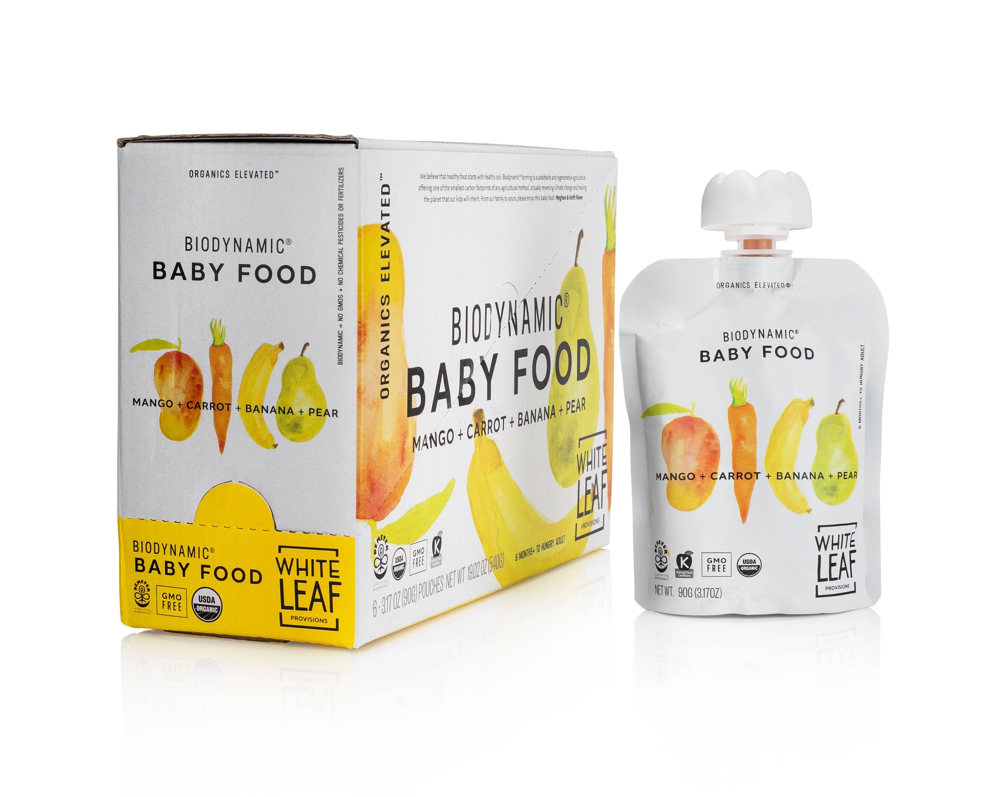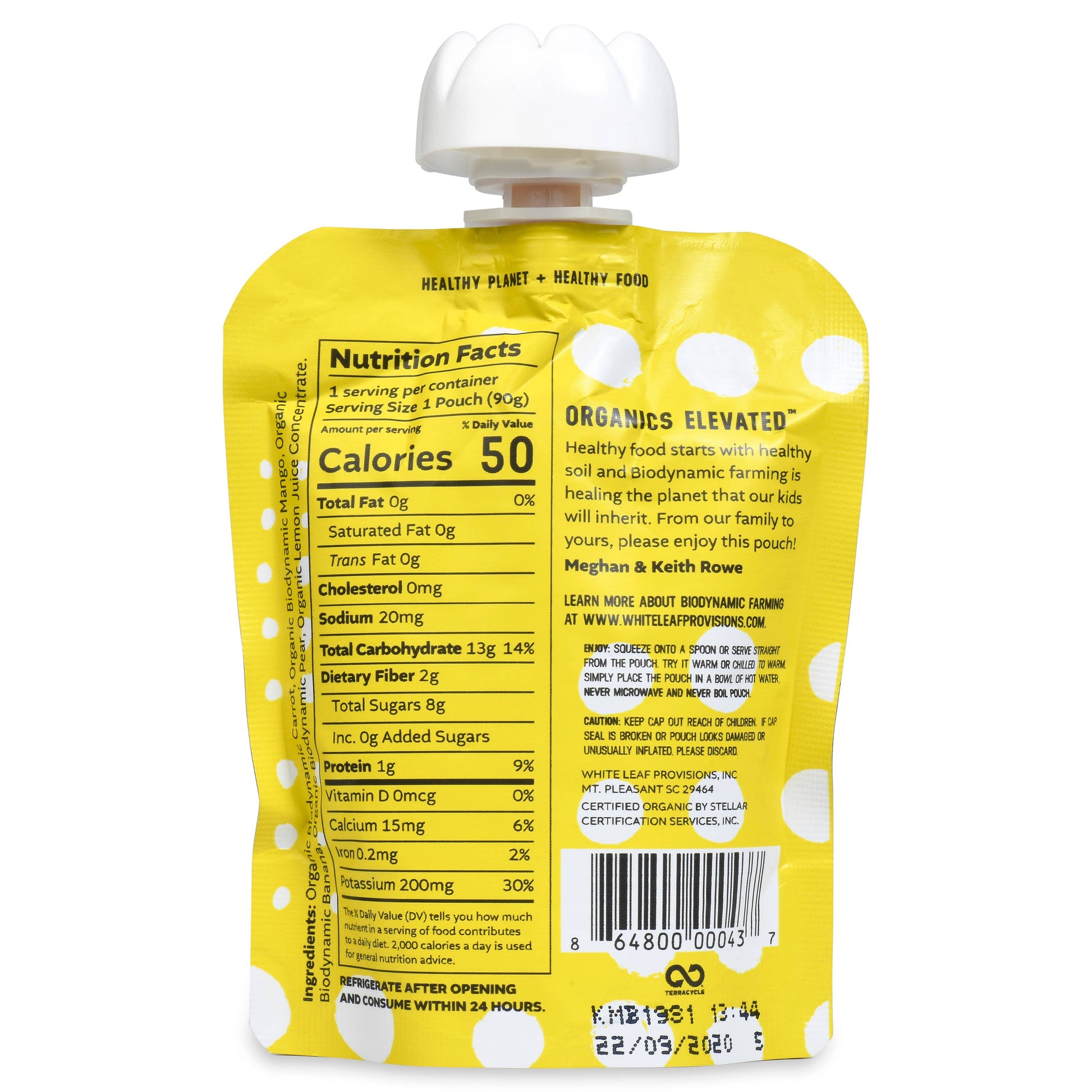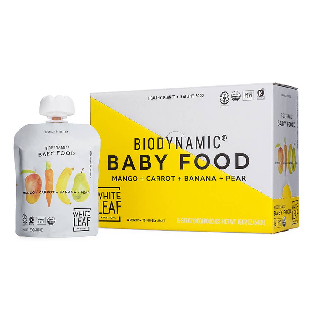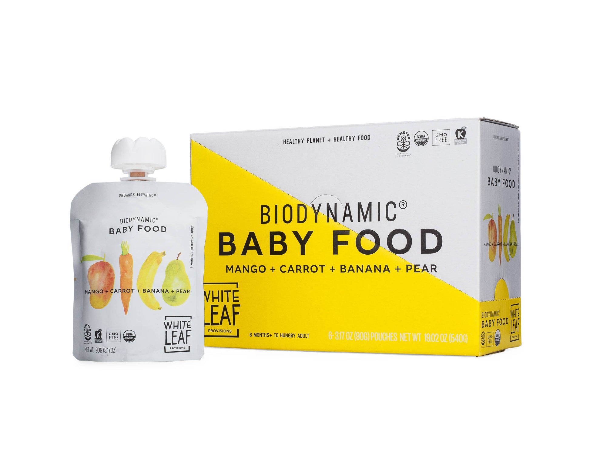 There are 6 (90g) pouches in a carton. Ready for babies 6 months to hungry adults. Organic Biodynamic Baby Food - Mango+Carrot+Banana +Pear. Biodynamic organic mango puree, biodynamic organic carrot puree, biodynamic organic banana puree, biodynamic organic pear puree, organic lemon juice concentrate.