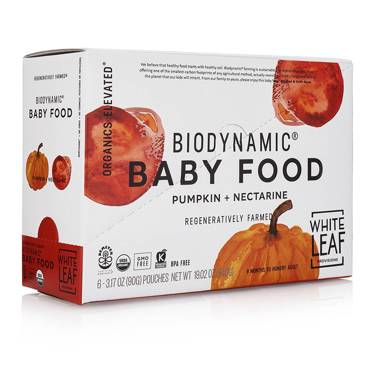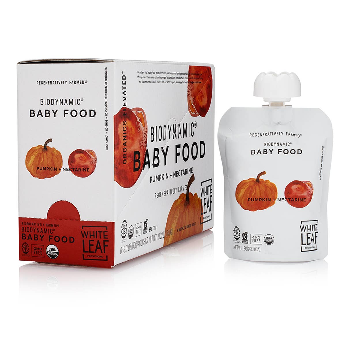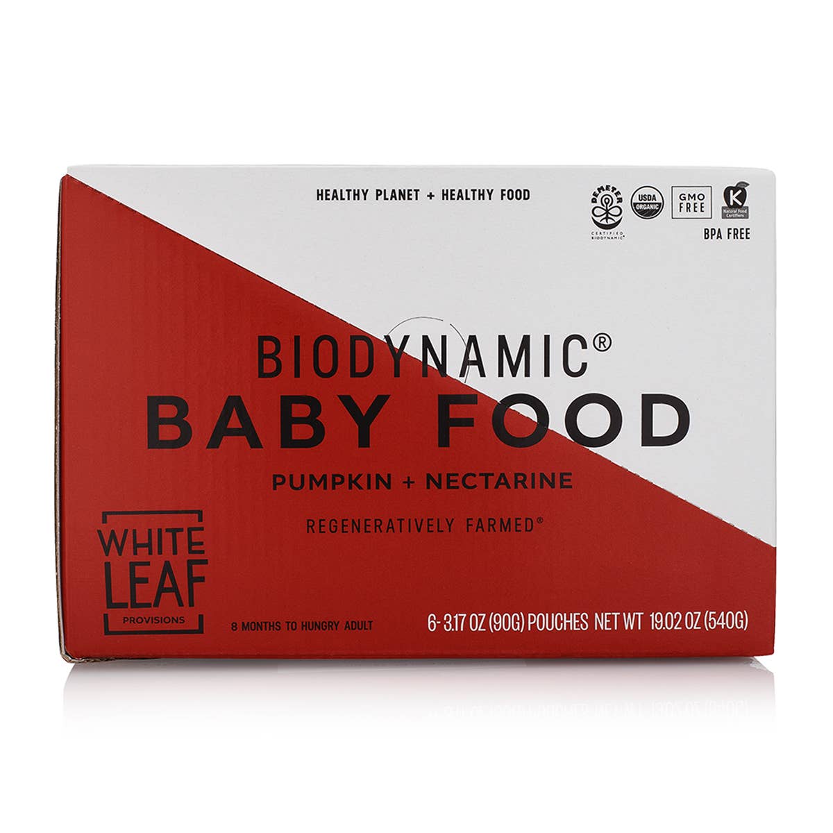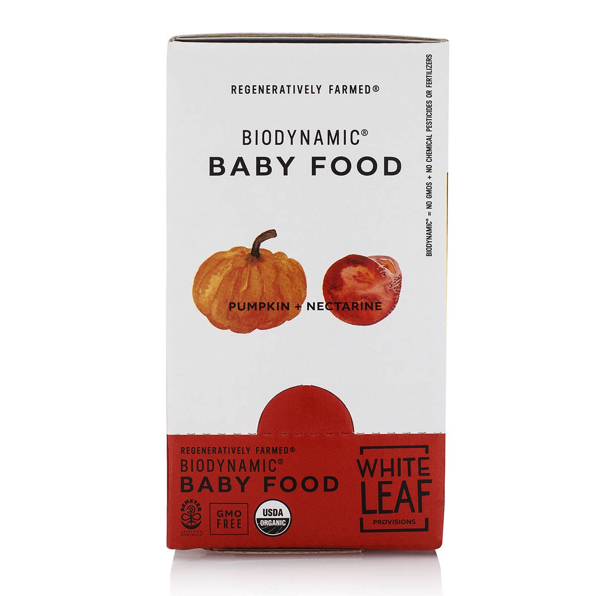 There are 6 (90g) pouches in a carton. Organic Biodynamic Baby Food - Pumpkin+Nectarine. Biodynamic organic pumpkin puree, biodynamic organic nectarine puree.