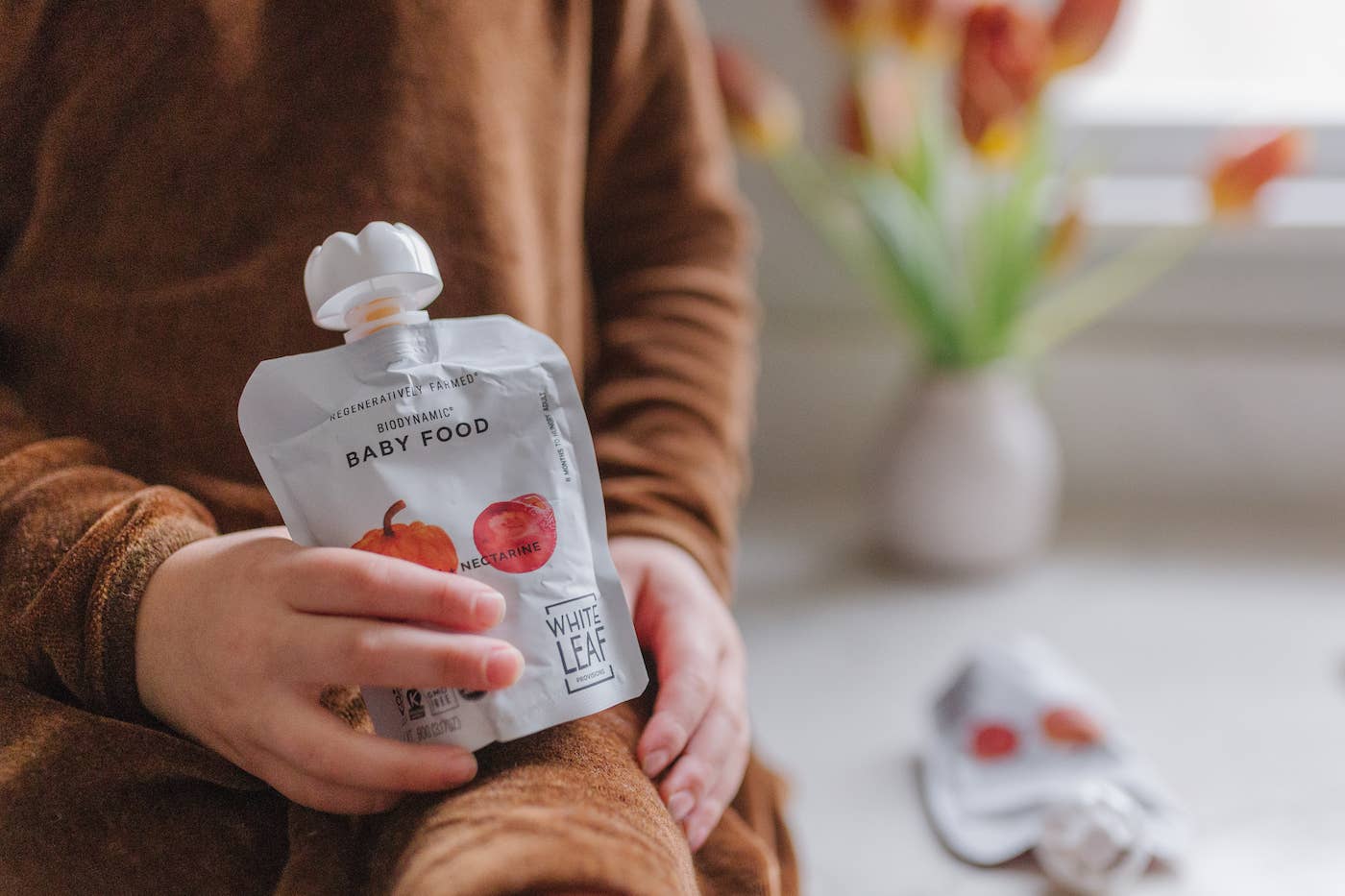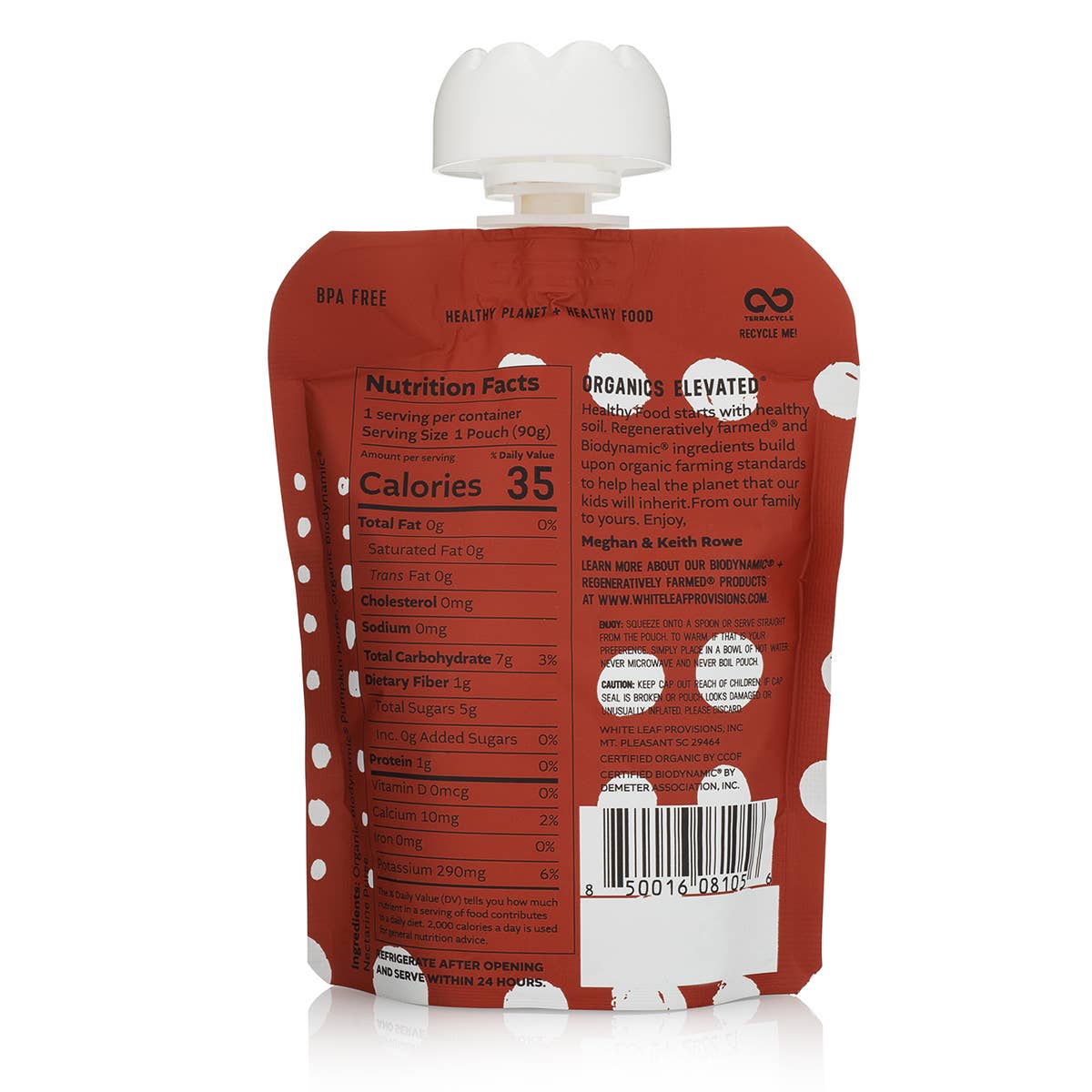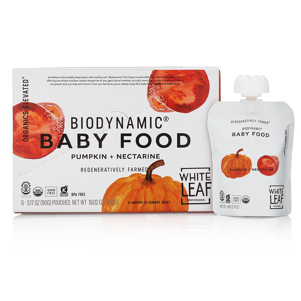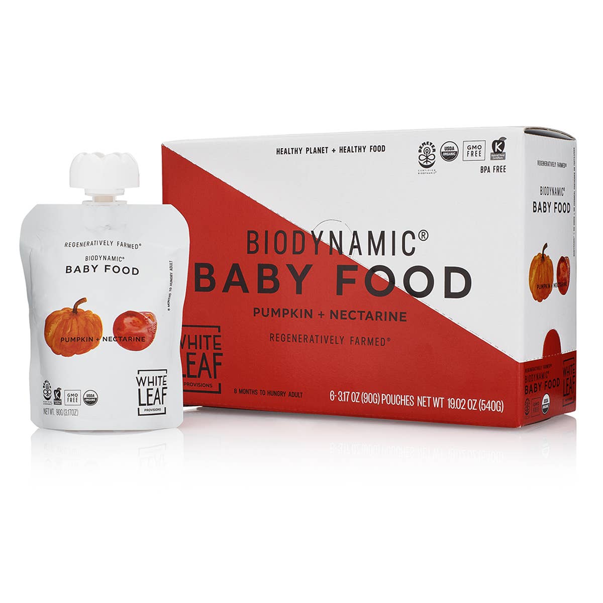 There are 6 (90g) pouches in a carton. Organic Biodynamic Baby Food - Pumpkin+Nectarine. Biodynamic organic pumpkin puree, biodynamic organic nectarine puree.