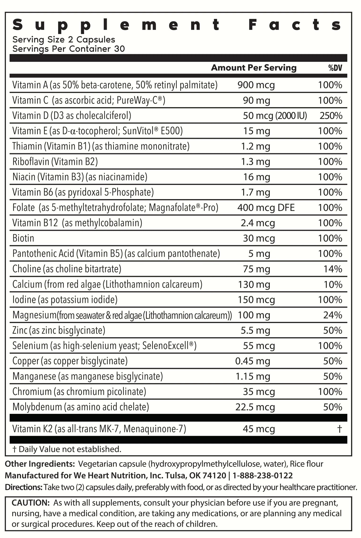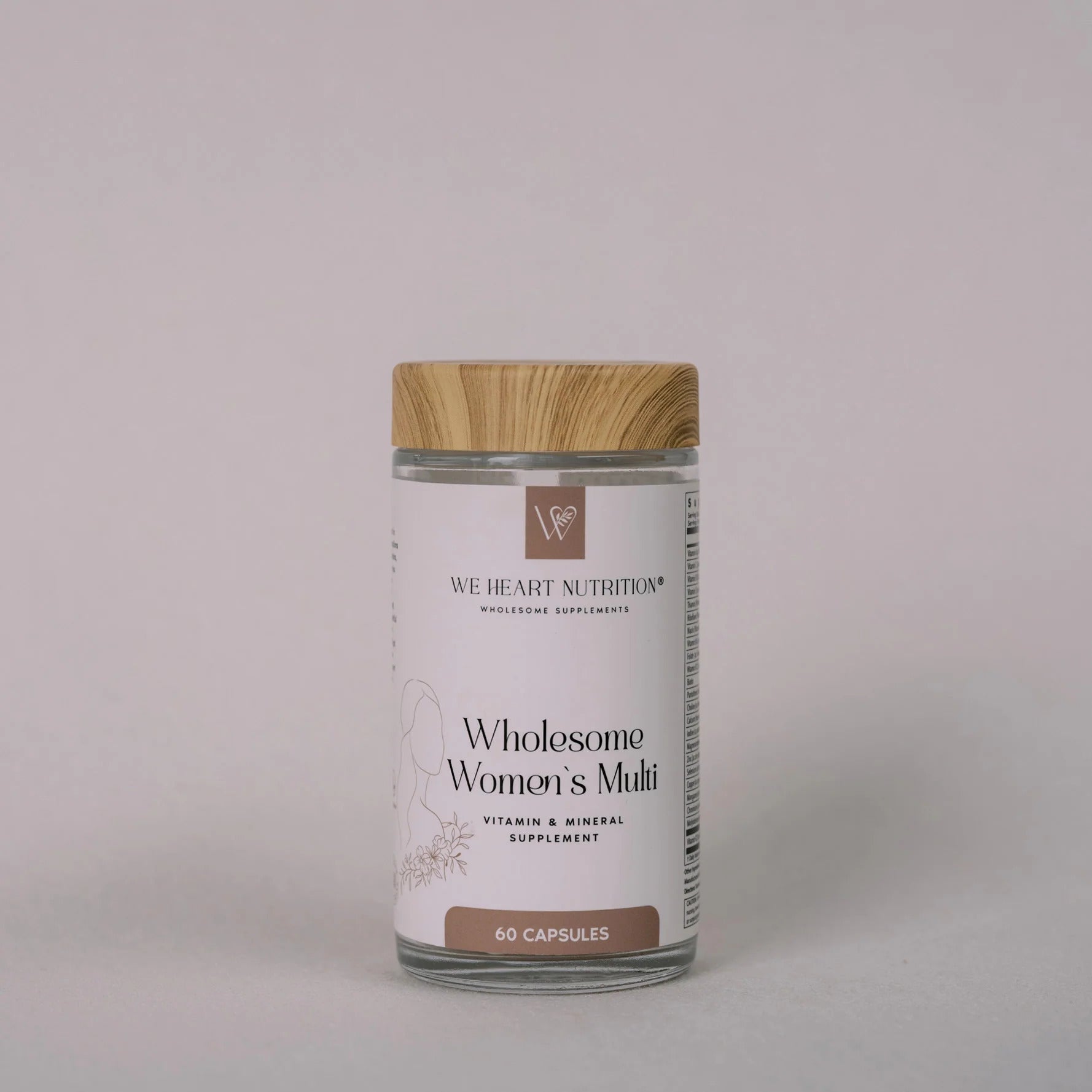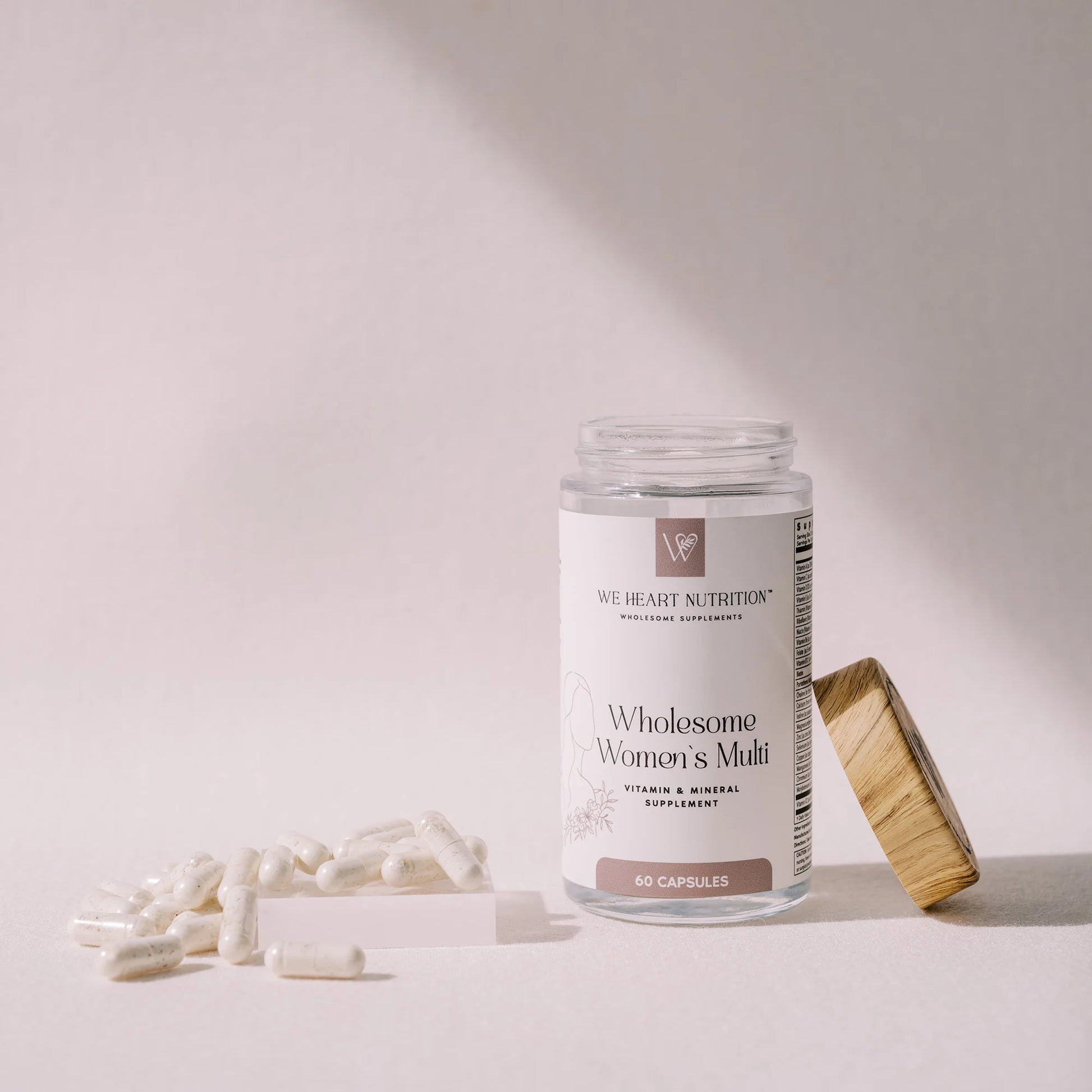 Nourish your body from the inside out with Wholesome Woman's Multivitamin by WeHeart Nutrition- a clean, comprehensive daily formula designed to support woman's health, energy, mood, and immune function.